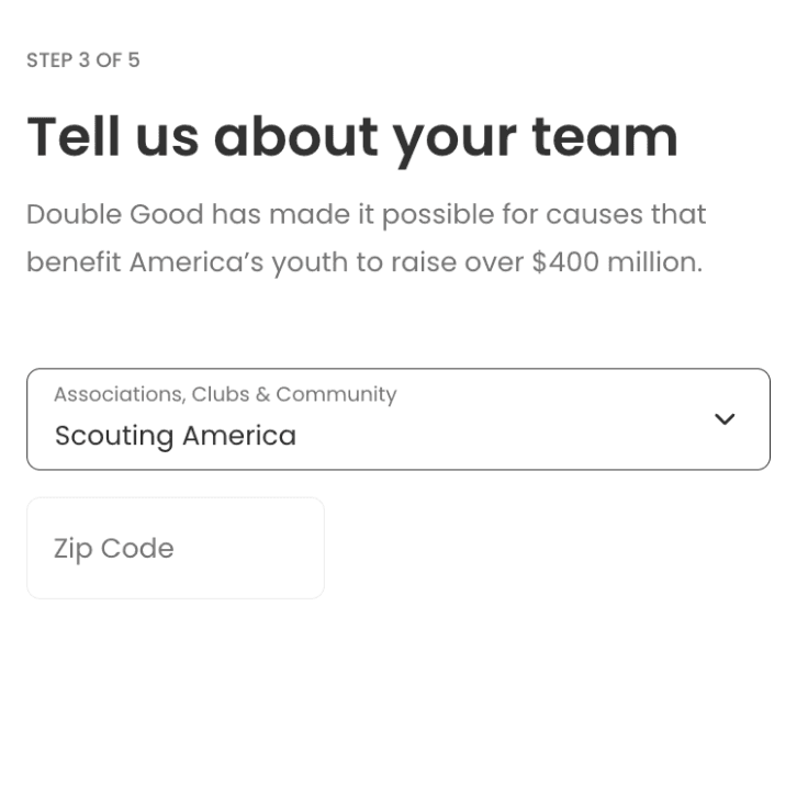 Choose 'Association, Clubs, & Community' as the organization type, 'Boy Scouts of America- 127 Three Fires Council' as the organization name, use your Unit # for team name, and select 'Scouting America' when asked to tell us about your team.