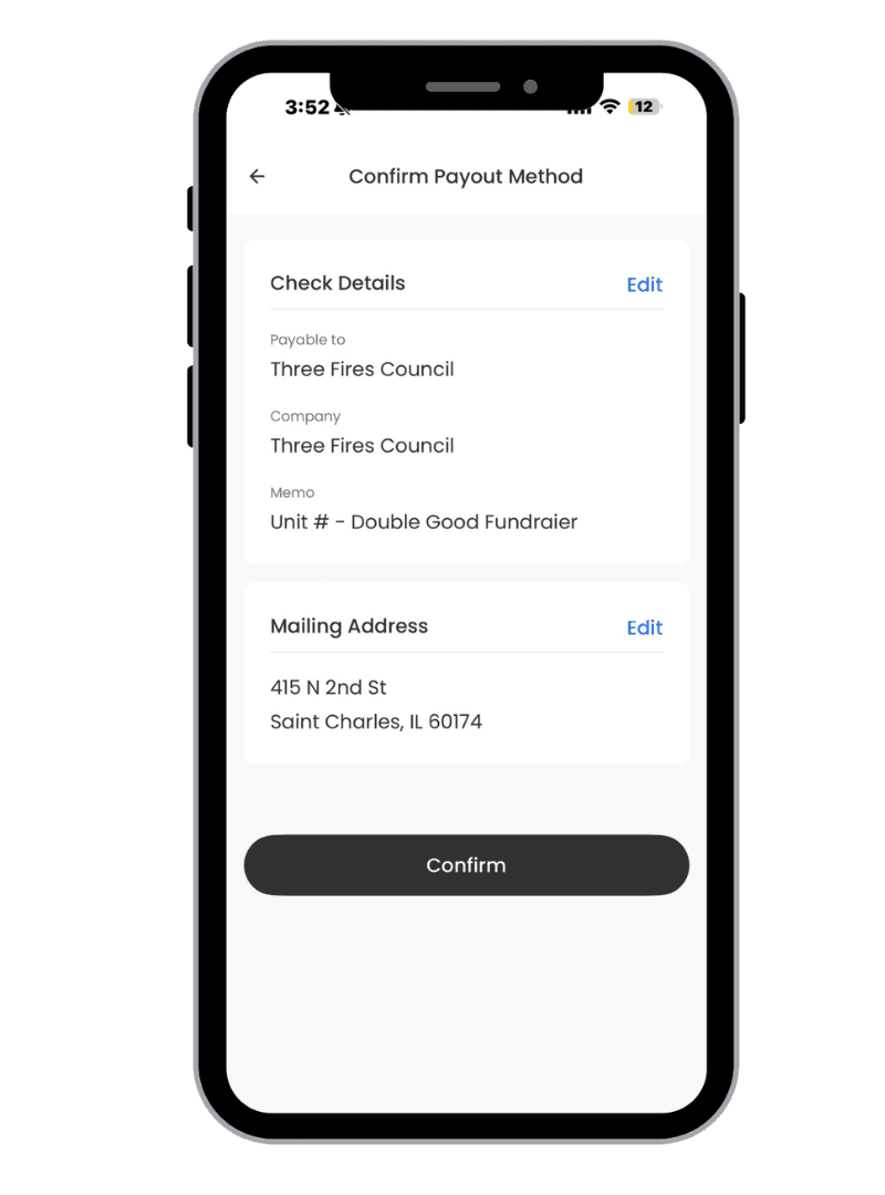 All fundraisers should be set up to pay Three Fires Council. Select check as the payout method, make it payable to Three Fires Council, and mail it to 415 N 2nd St, St. Charles, IL 60174.